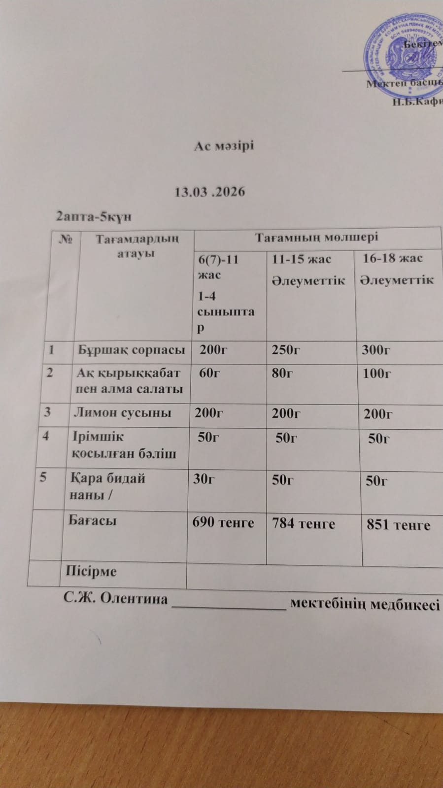 Асхана мәзірі 13.03.2026