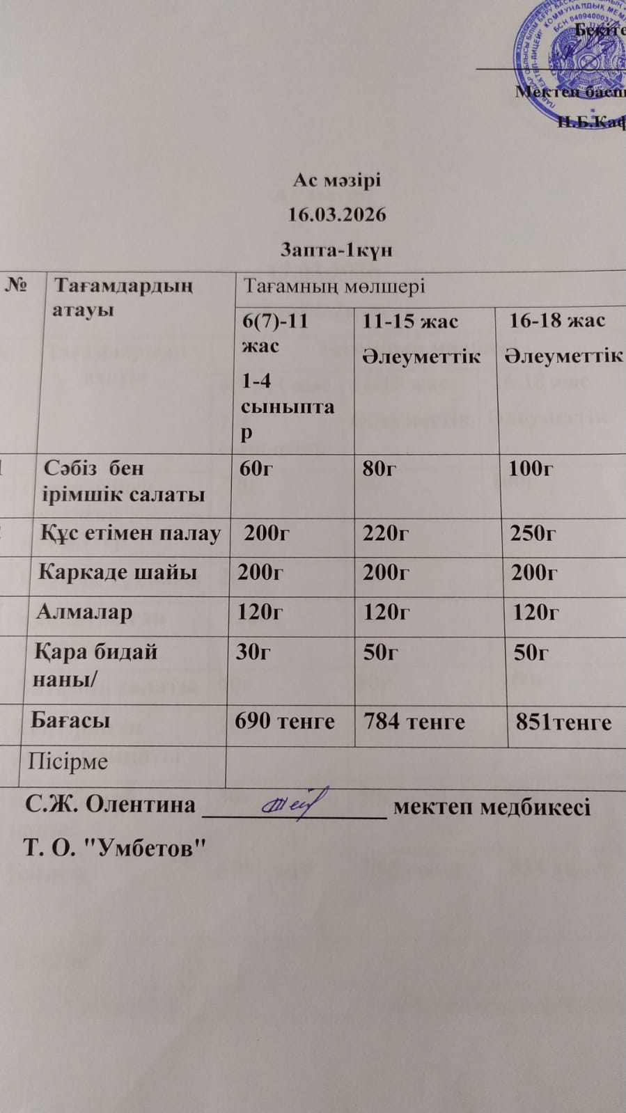Асхана мәзірі 16.03.2026