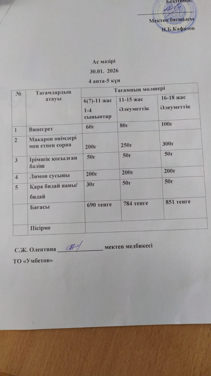 Асхана мәзірі 30.01.2026