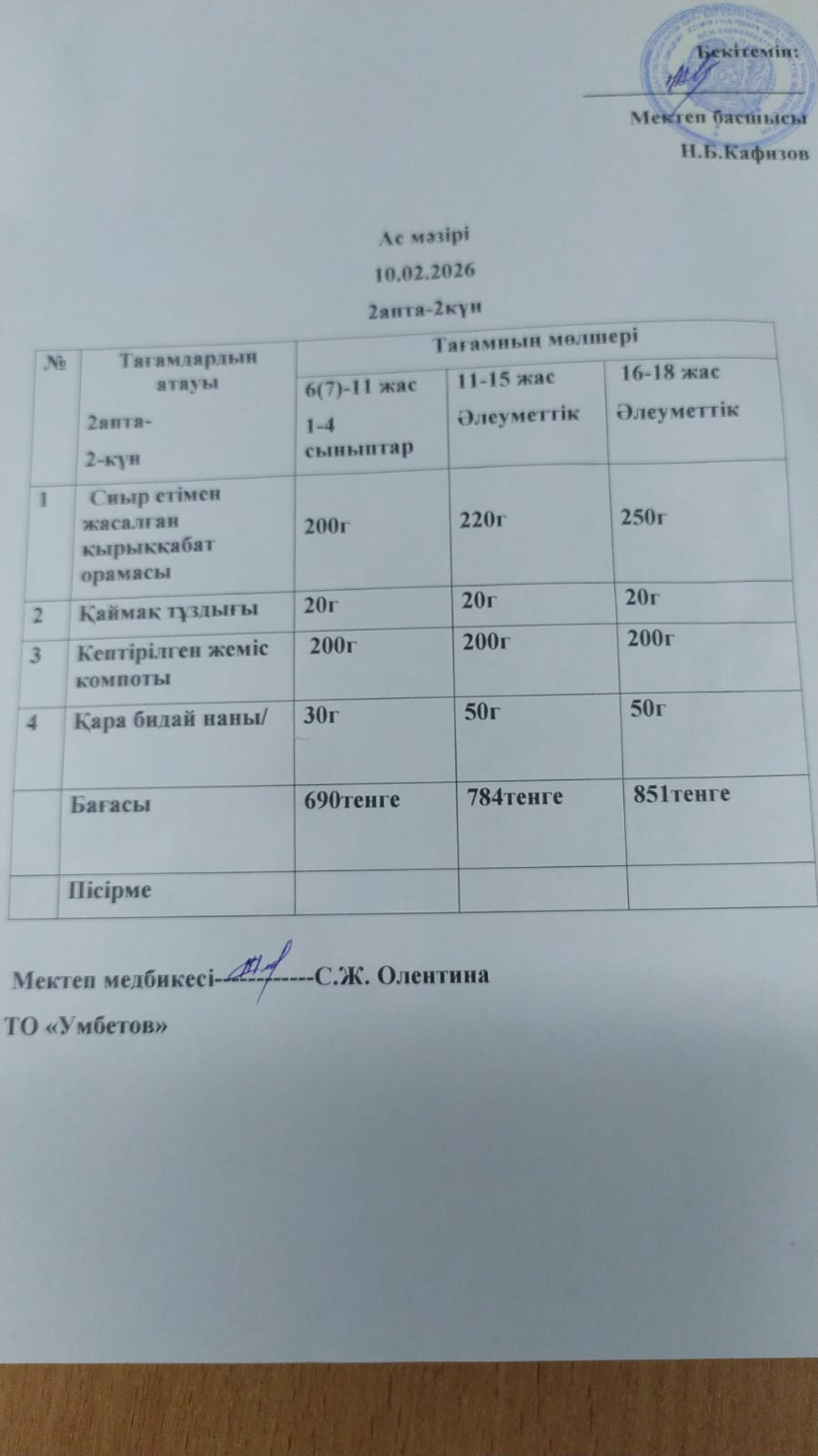 Асхана мәзірі 10.02.2026