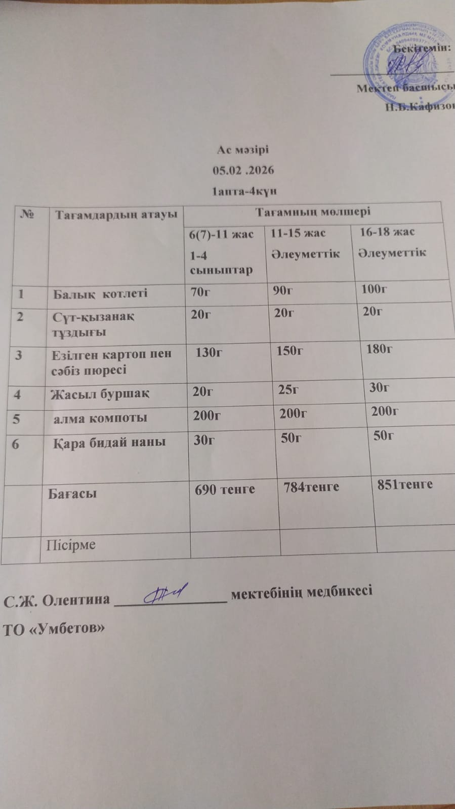 Асхана мәзірі 6.02.2026