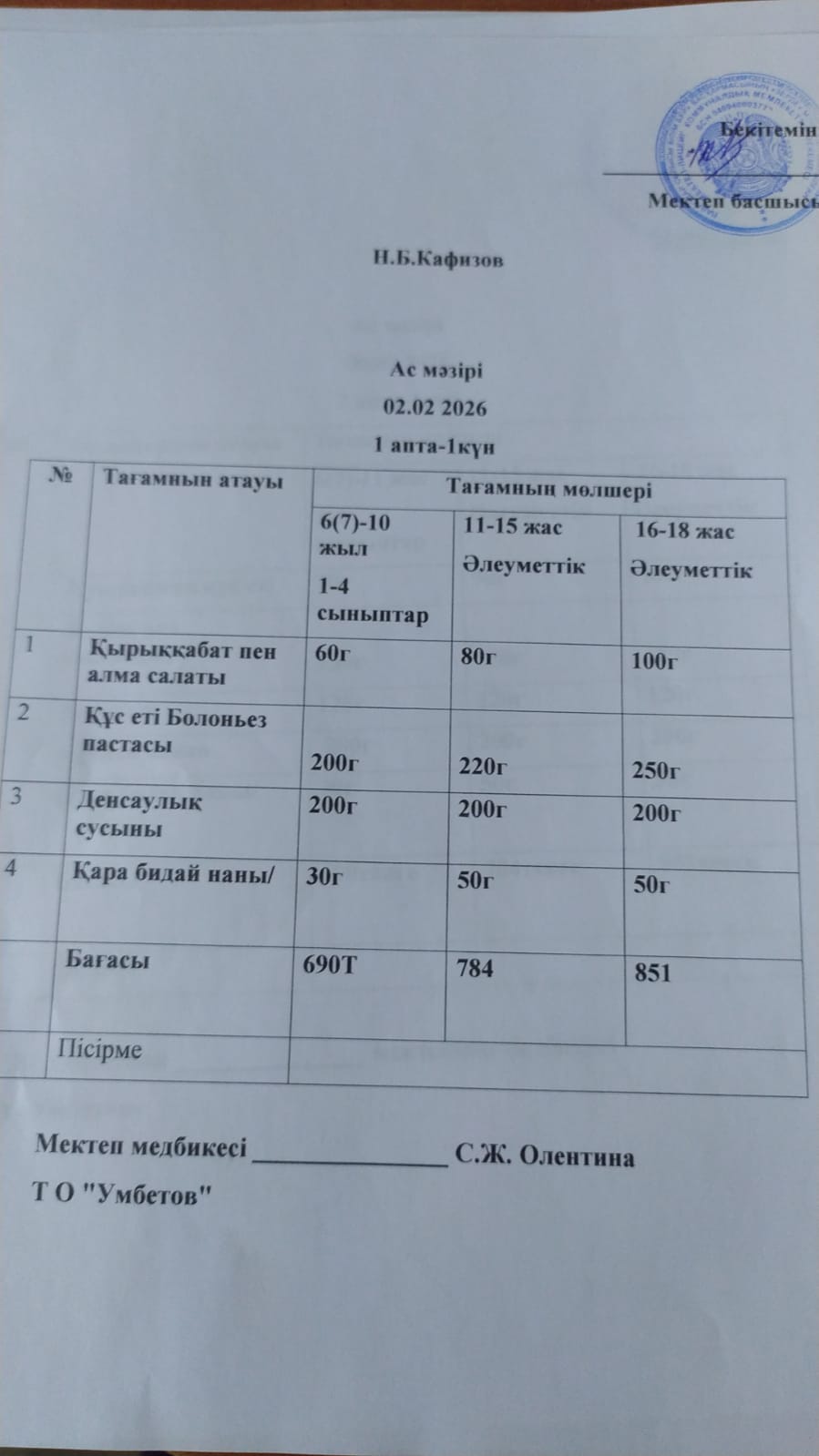 Асхана мәзірі 2.02.2026