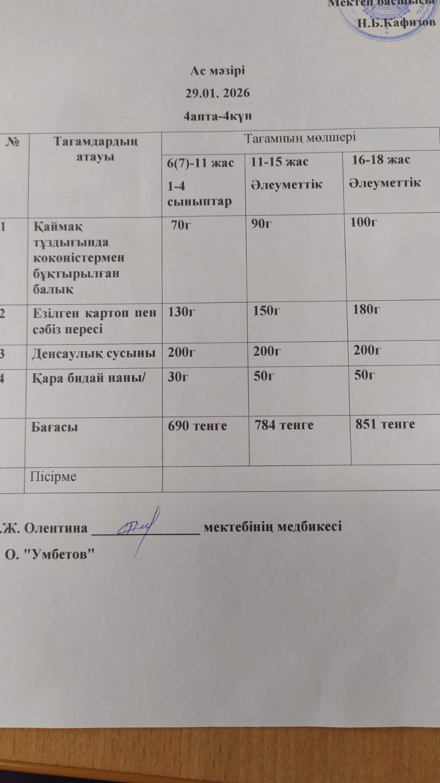 Асхана мәзірі 29.01.2026