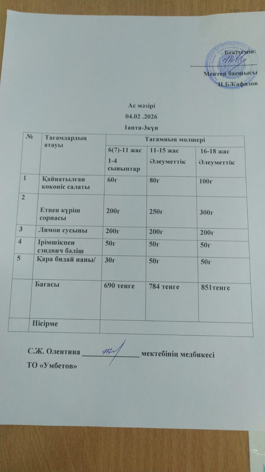 Асхана мәзірі 4.02.2026