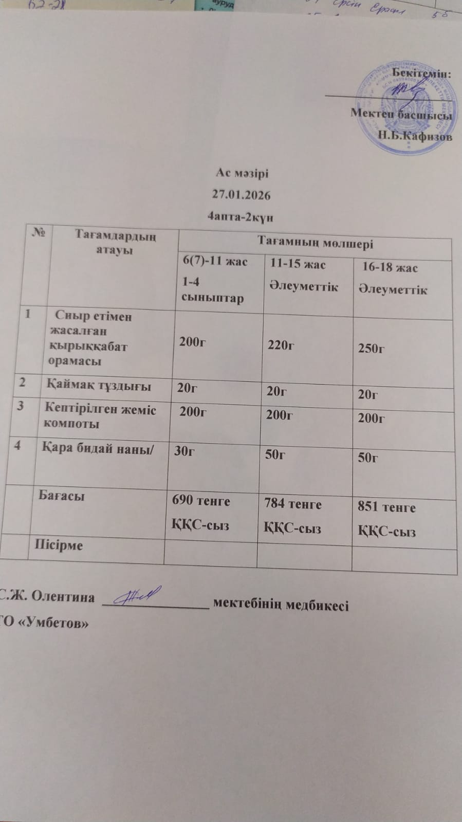 Асхана мәзірі 27.01.2026