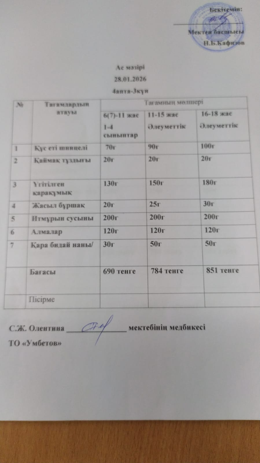 Асхана мәзірі 28.01.2026