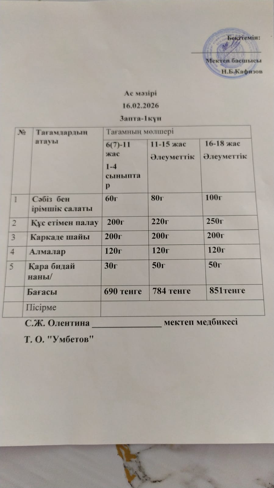 Асхана мәзірі 16.02.2026