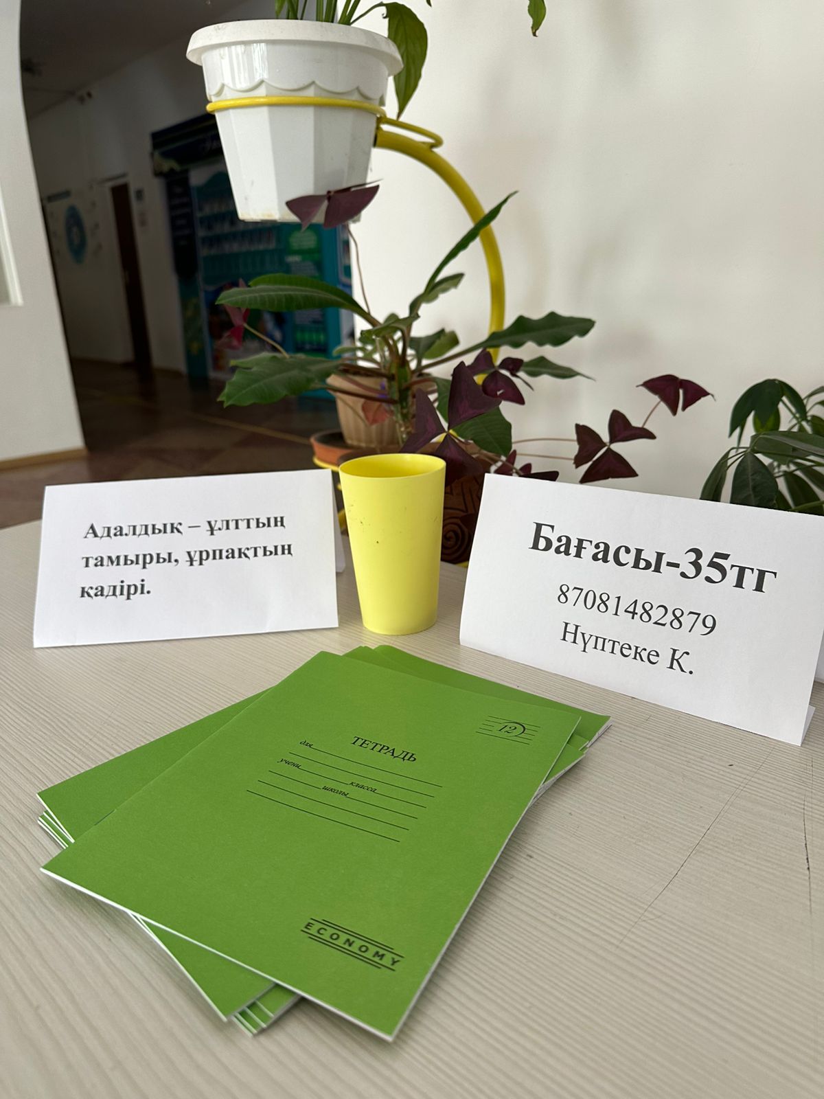 Шара барысында арнайы үстелге 30 дәптер қойылып, қасына ақша салатын ыдыс орналастырылды. Оқушыларға ешкімнің бақылауынсыз дәптер алып, ақшаны өз еркімен ыдысқа салу ұсынылды. Бұл арқылы олардың адалдық деңгейі мен ар-ождан сезімі байқалды.